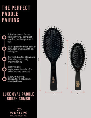 Our new LUXE Oval Paddle cushion brushes are designed to effortlessly detangle, smoothen, and style your hair, while ensuring a gentle touch that respects the health of your strands. Standard and Purse size.