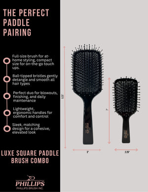 Our new LUXE Square Paddle cushion brushes are designed to effortlessly detangle, smoothen, and style your hair, while ensuring a gentle touch that respects the health of your strands. Standard and Purse size.