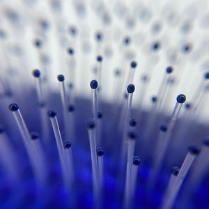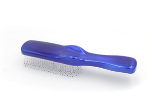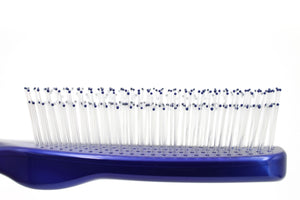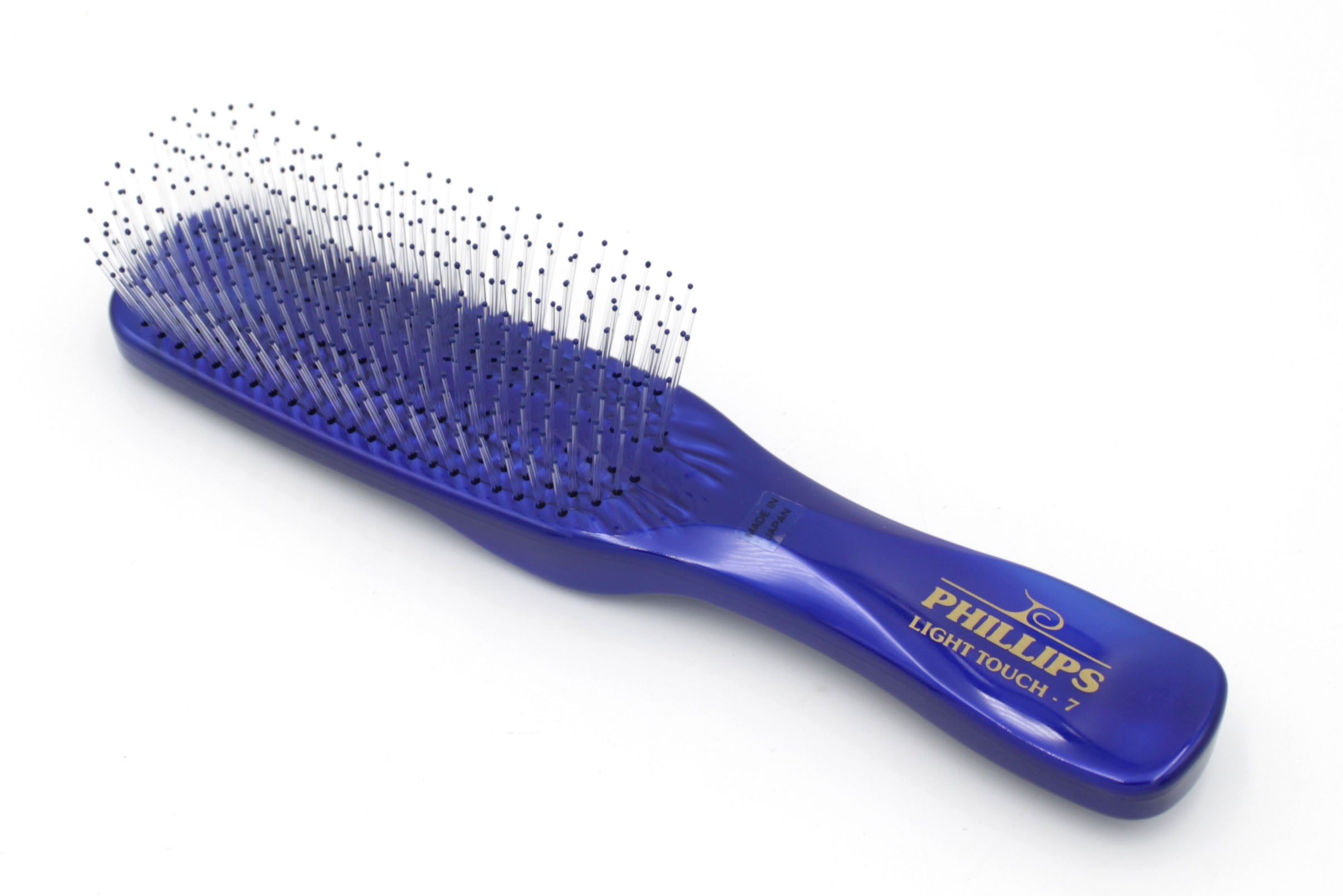The Light Touch 7 is a blue rectangular brush with soft and flexible ball-tipped clear nylon bristle. Tufting 2 piece bristle design with dual-length rounded tip for a gentle soft touch; detangle releasing natural oil while stimulating scalp for shiny healthy hair. Bristles are closely spaced so that even the shortest of hairs are not missed.