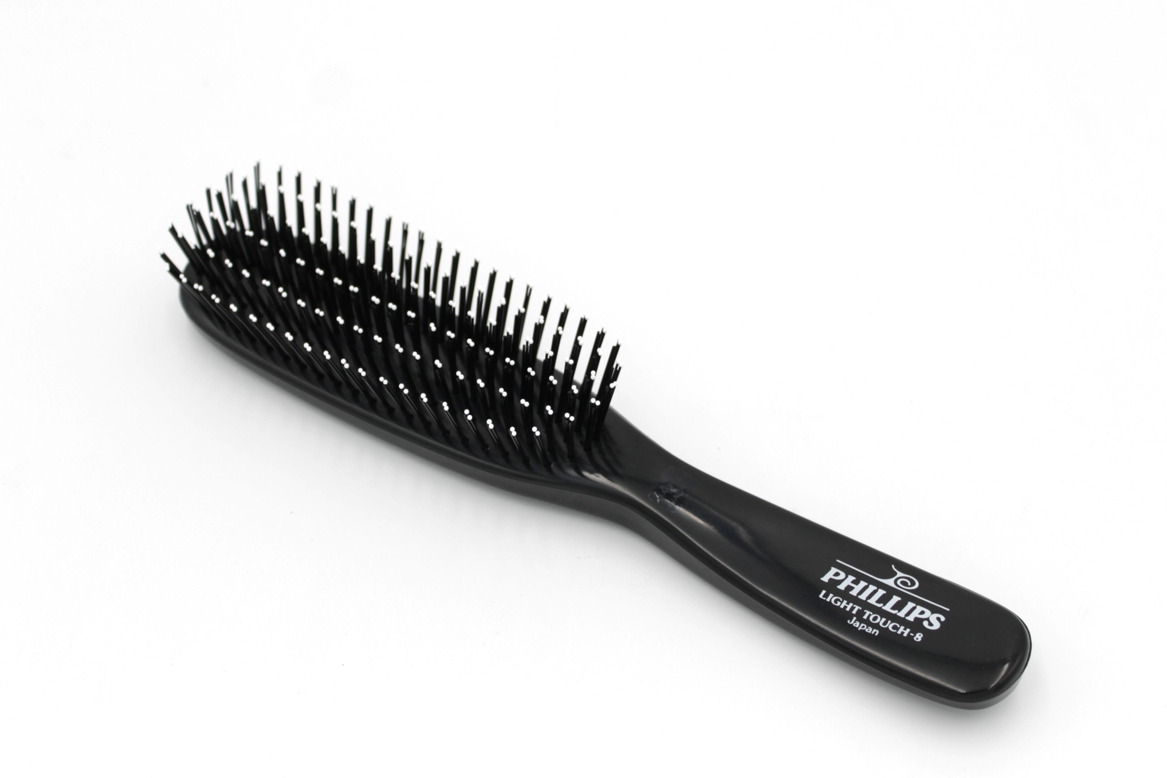 The Light Touch 8 is a black rectangular brush with soft and flexible ball-tipped nylon bristle. Tufting 2 piece bristle design with dual-length rounded tip for a gentle soft touch; detangle releasing natural oil while stimulating scalp for shiny healthy hair. Bristles are closely spaced so that even the shortest of hairs are not missed.
