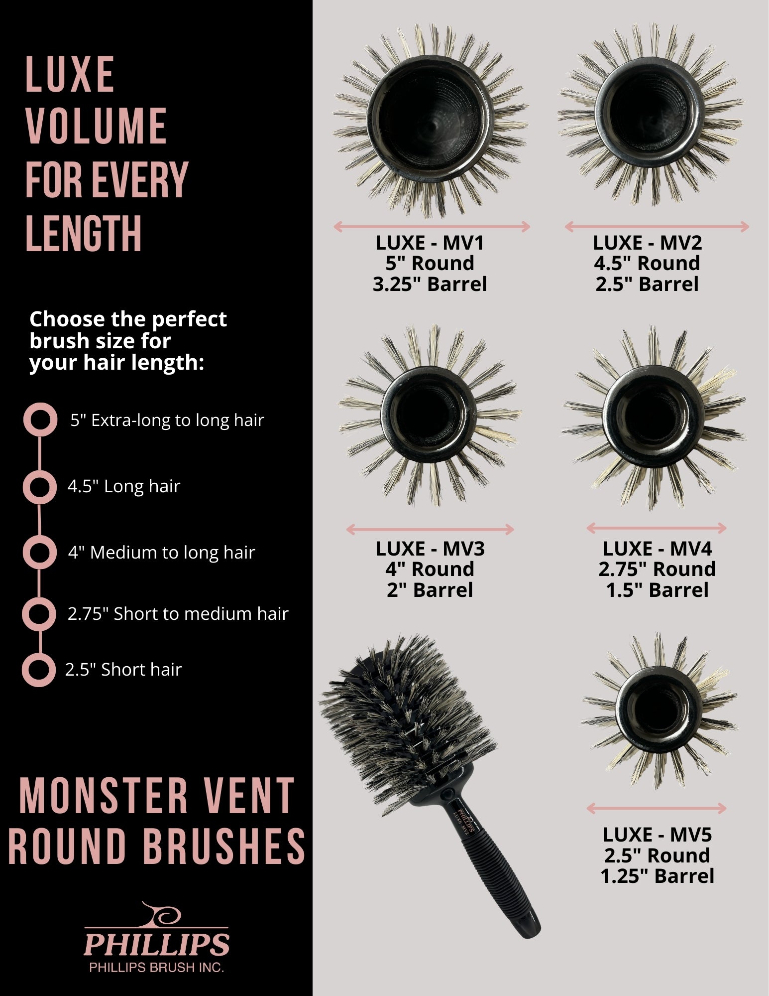 The monster vent round brushes are a cornerstone in our brush line. The vented design promotes efficient airflow reducing drying time and enhancing styling control. The combination of mixed boar and ionic nylon bristle reinforces the bristle's stiffness and provides strong penetration for thick and coarse hair. Available in various sizes.