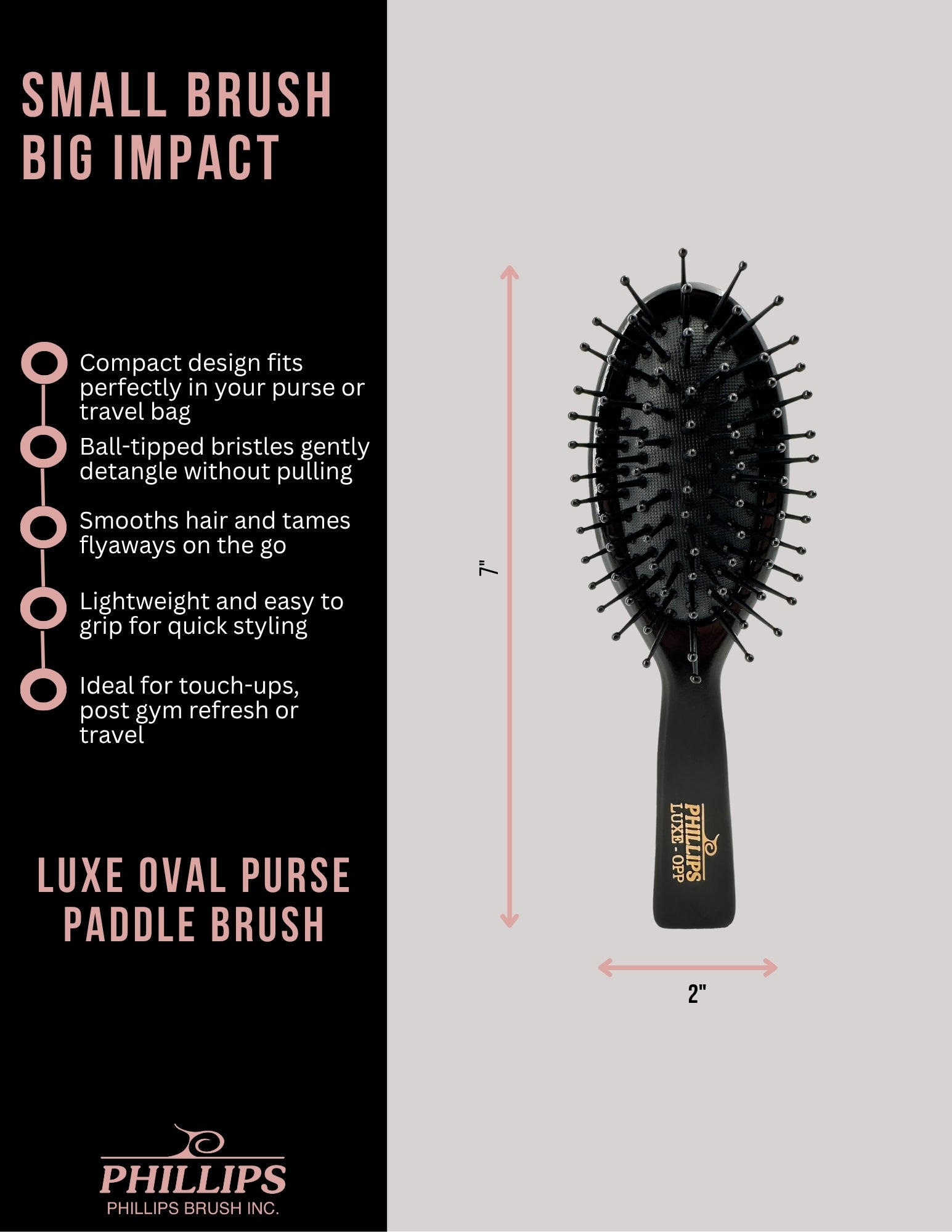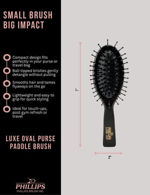 Our new LUXE Oval Paddle Purse cushion brush is designed to effortlessly detangle, smoothen, and style your hair, while ensuring a gentle touch that respects the health of your strands. Easily fits into travel bags and purses.