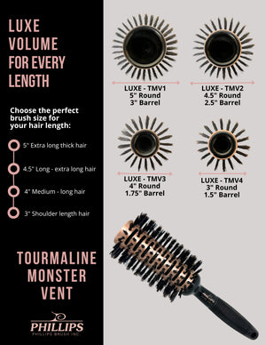 Our Tourmaline Monster Vent Round Brushes are a fusion of innovation and style. The incorporation of tourmaline enhances the brushes' performance by emitting negative ions, promoting smoother and shinier hair. The vented design ensures efficient airflow, reducing drying time and allowing for precise styling control. These brushes feature a carefully crafted wood handle with a raised rubber grip, providing both elegance and ergonomic comfort during styling sessions. Available in various sizes.