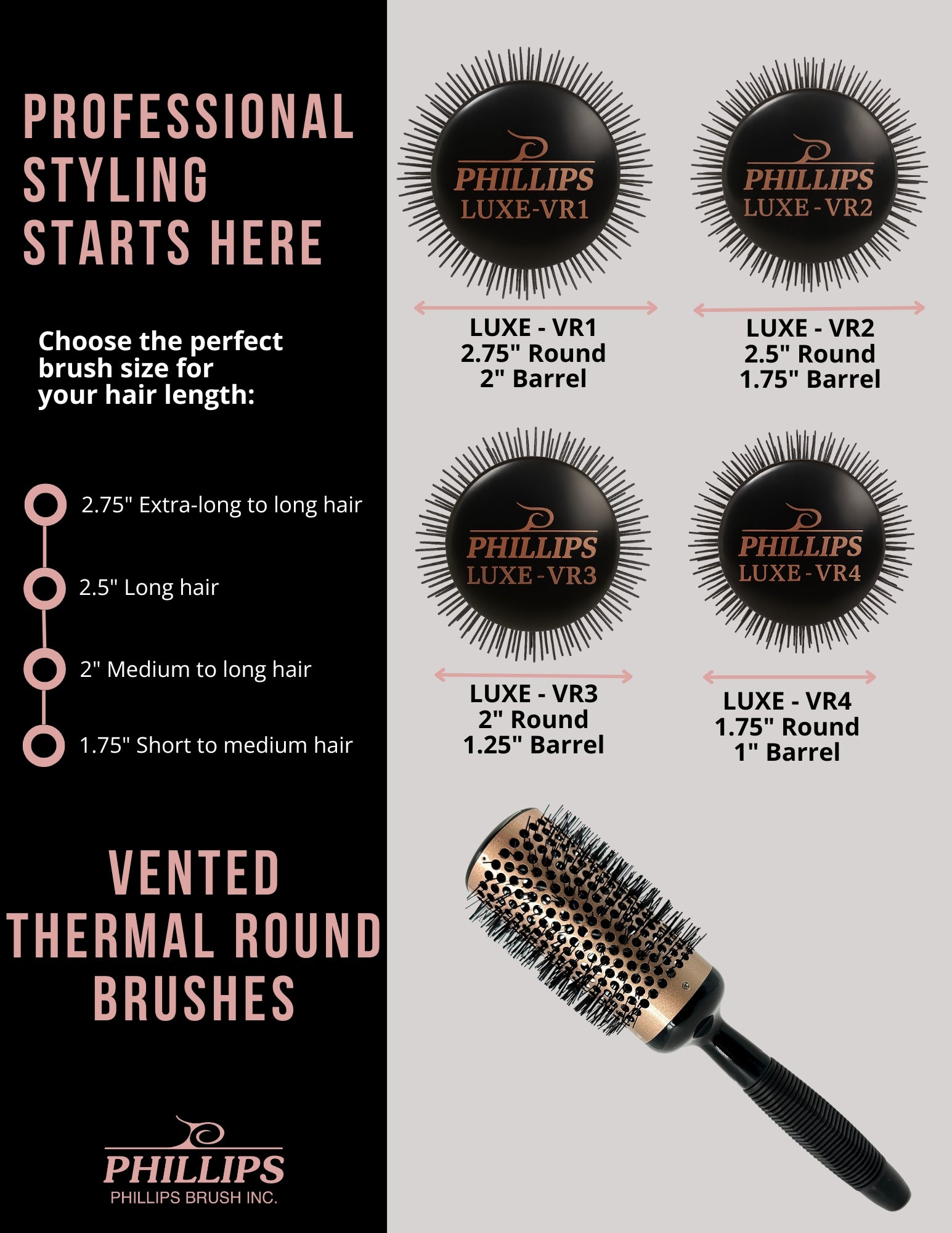 Our LUXE Vented Round brushes feature advanced thermal technology, allowing for efficient heat distribution during styling. Achieve salon-quality results with ease. Available in various sizes.